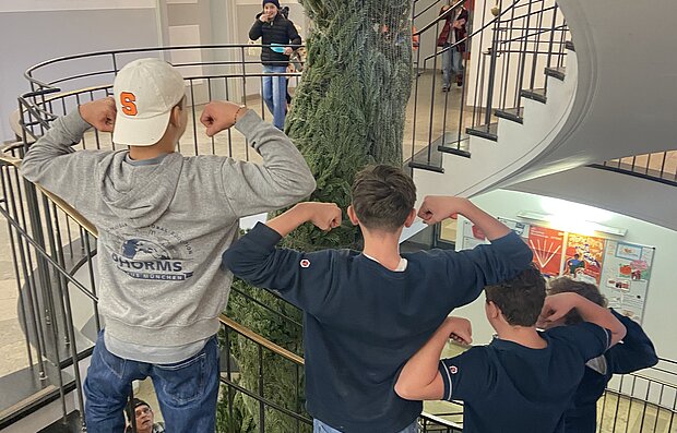 Diese Woche wurde unser diesjähriger Weihnachtsbaum gemeinsam mit einigen engagierten Schülern aufgestellt und von unseren Hausmeistern geschmückt. Die ersten Lichter lassen ihn schon strahlen, und bald wird unser Baum in vollem Glanz erleuchten, wenn die viele Kunstprojekte unserer Schülerinnen und Schülern auch am baum einen Platz finden