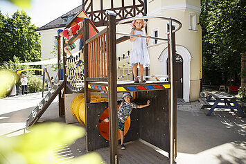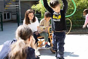 Der Vormittag startet mit einer pädagogischen Aktivität, die themenbezogen ist und gezielt einen der Entwicklungsbereiche fördert. Vor dem Mittagessen haben die Kinder noch einmal Zeit zum freien Spiel und zum Austoben – möglichst draußen im großzügigen Außenbereich.
