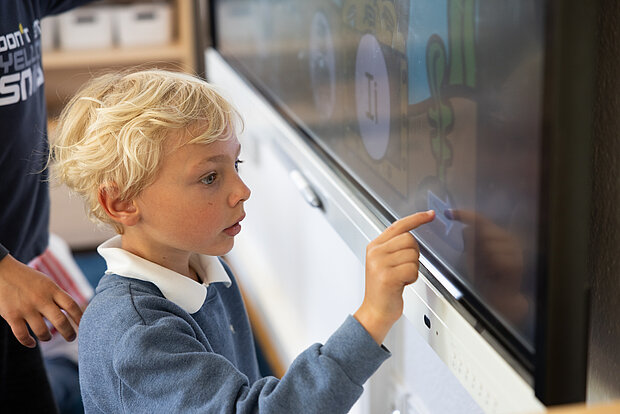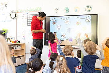 Unsere Vorschulgruppen verfügen jeweils über ein interaktives Smart-Display, das gezielt für pädagogische Aktivitäten eingesetzt wird.