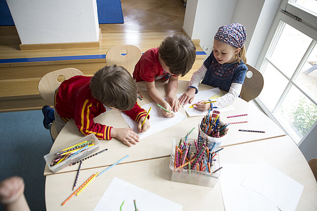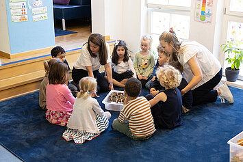 Die Kinder kommen mit ihren Pädagoginnen und Pädagogen zusammen, erzählen einander, wie es ihnen geht und erfahren, was der Tag für sie bereithält.